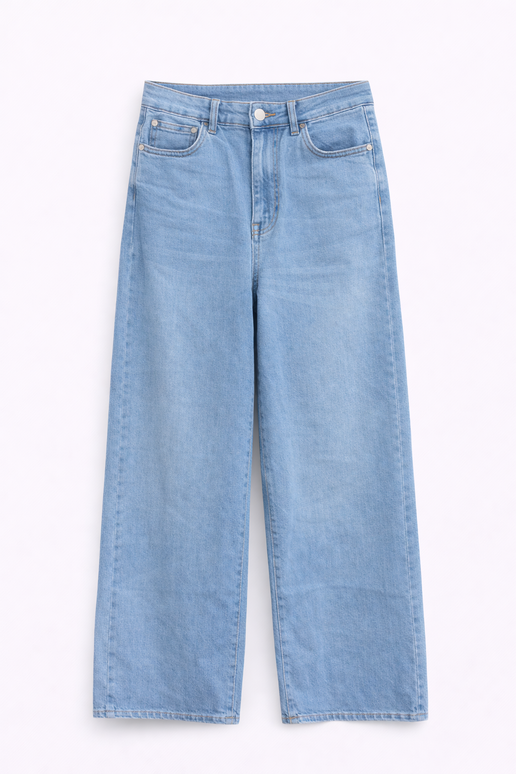 Calças wide leg e comprimento comprido, em ganga azul clara. Apresentam um estilo casual e versátil, ideal para combinações do dia a dia. Perfeitas para ocasiões informais e looks descontraídos.