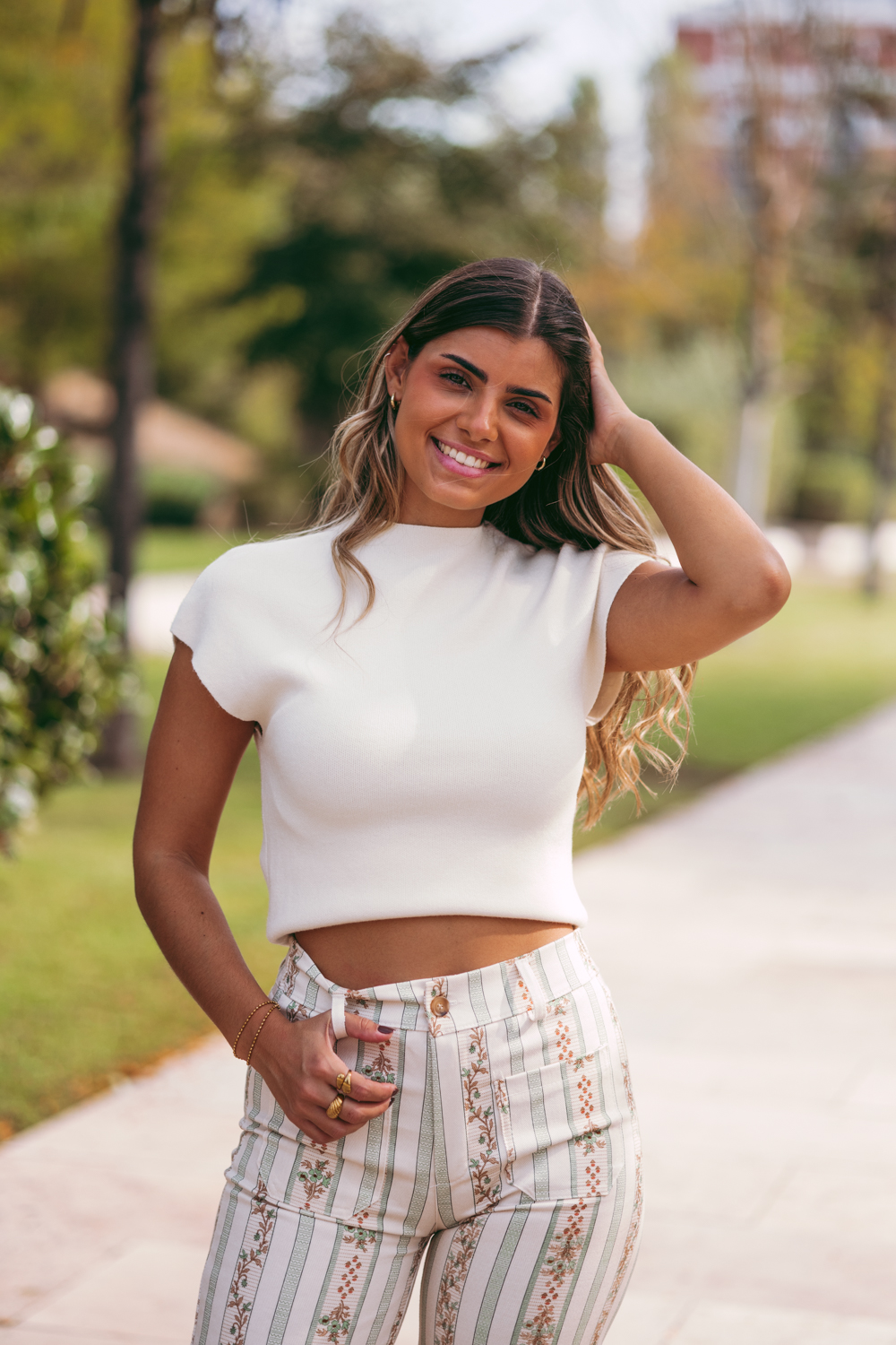 Calças com bolsos a frente e atrás, elástico atrás na cintura, botão e fecho