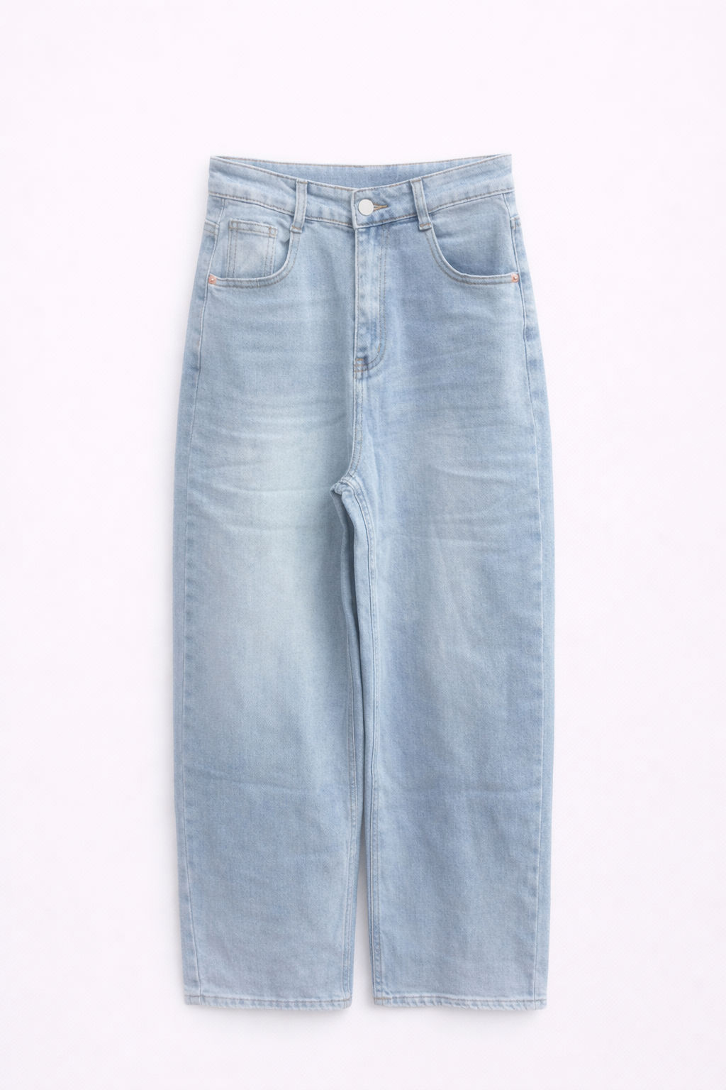 Calças de corte reto em ganga clara, com cintura subida e fecho frontal. Estilo casual e versátil, ideal para o dia a dia ou ocasiões descontraídas. Disponível em vários tamanhos para um ajuste confortável.