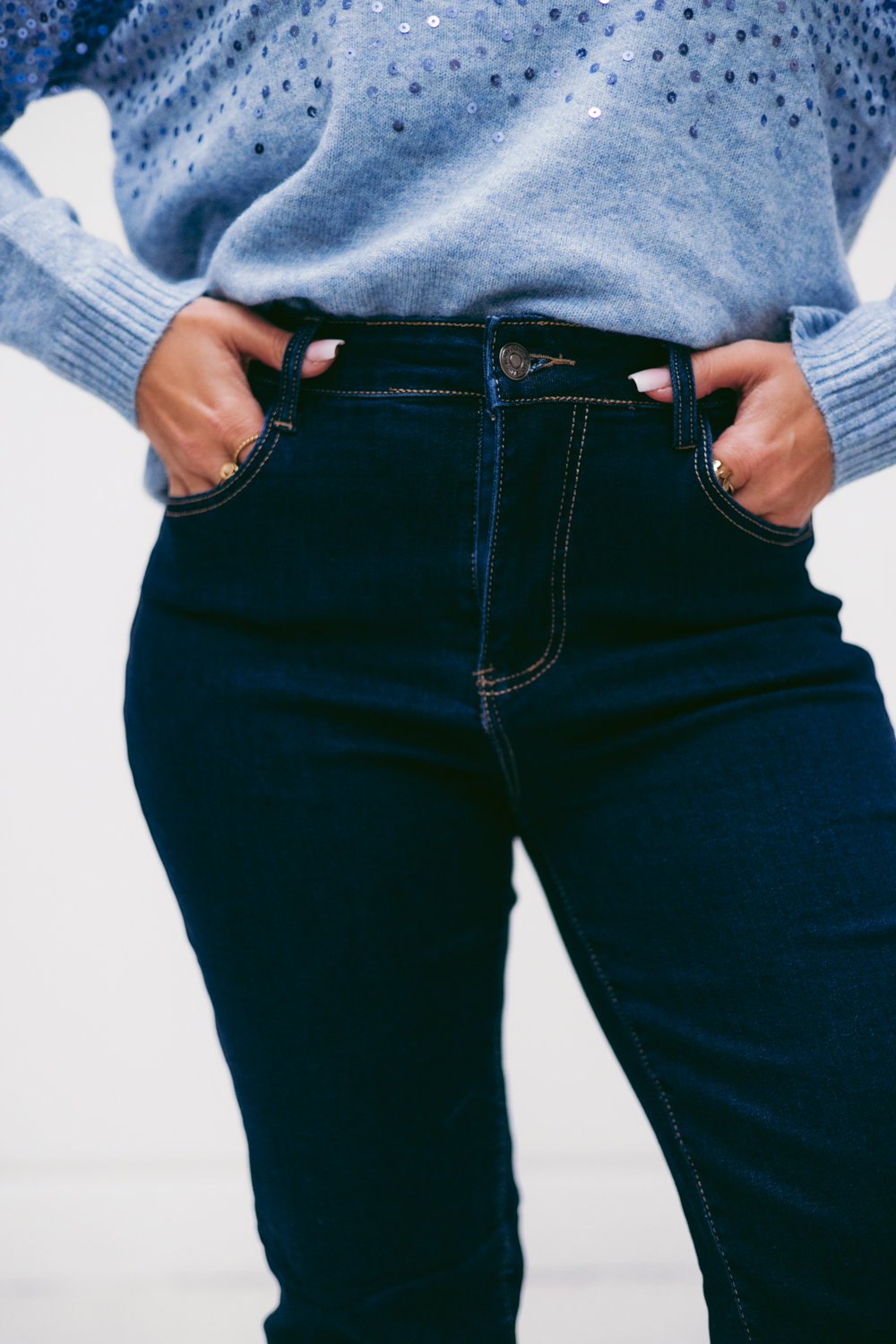 A modelo mede 152cm, pesa 51kg e está a vestir um 36