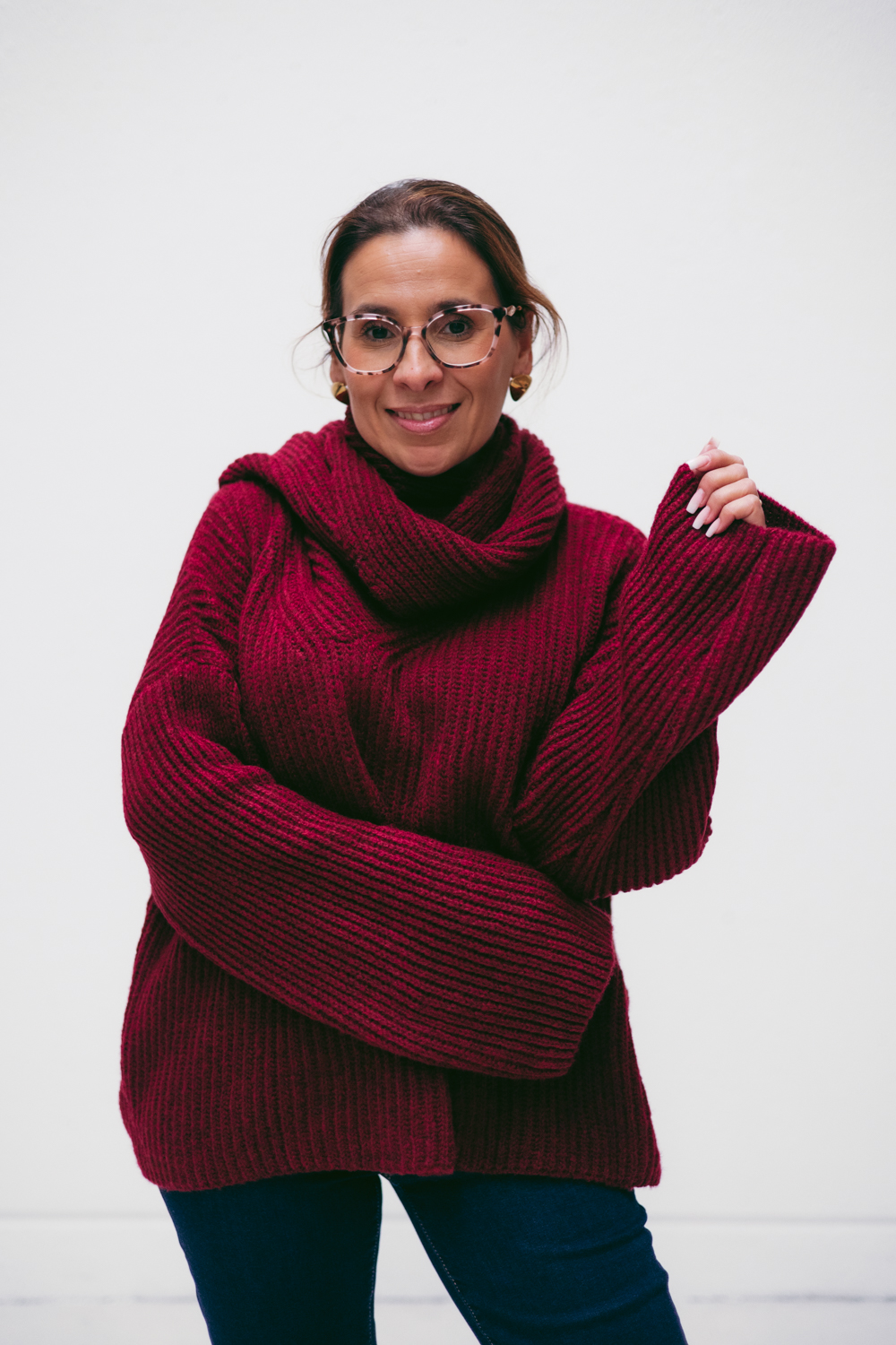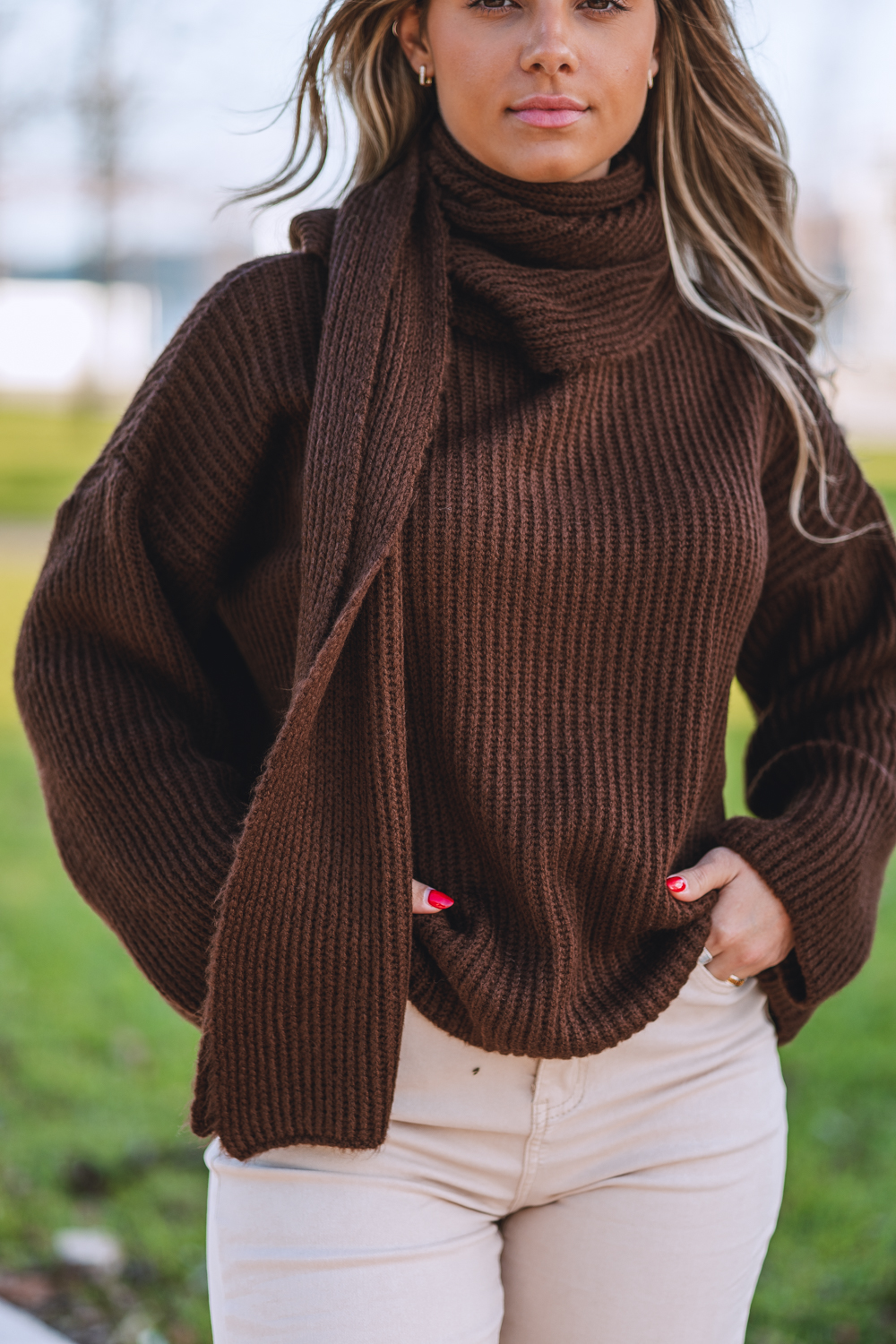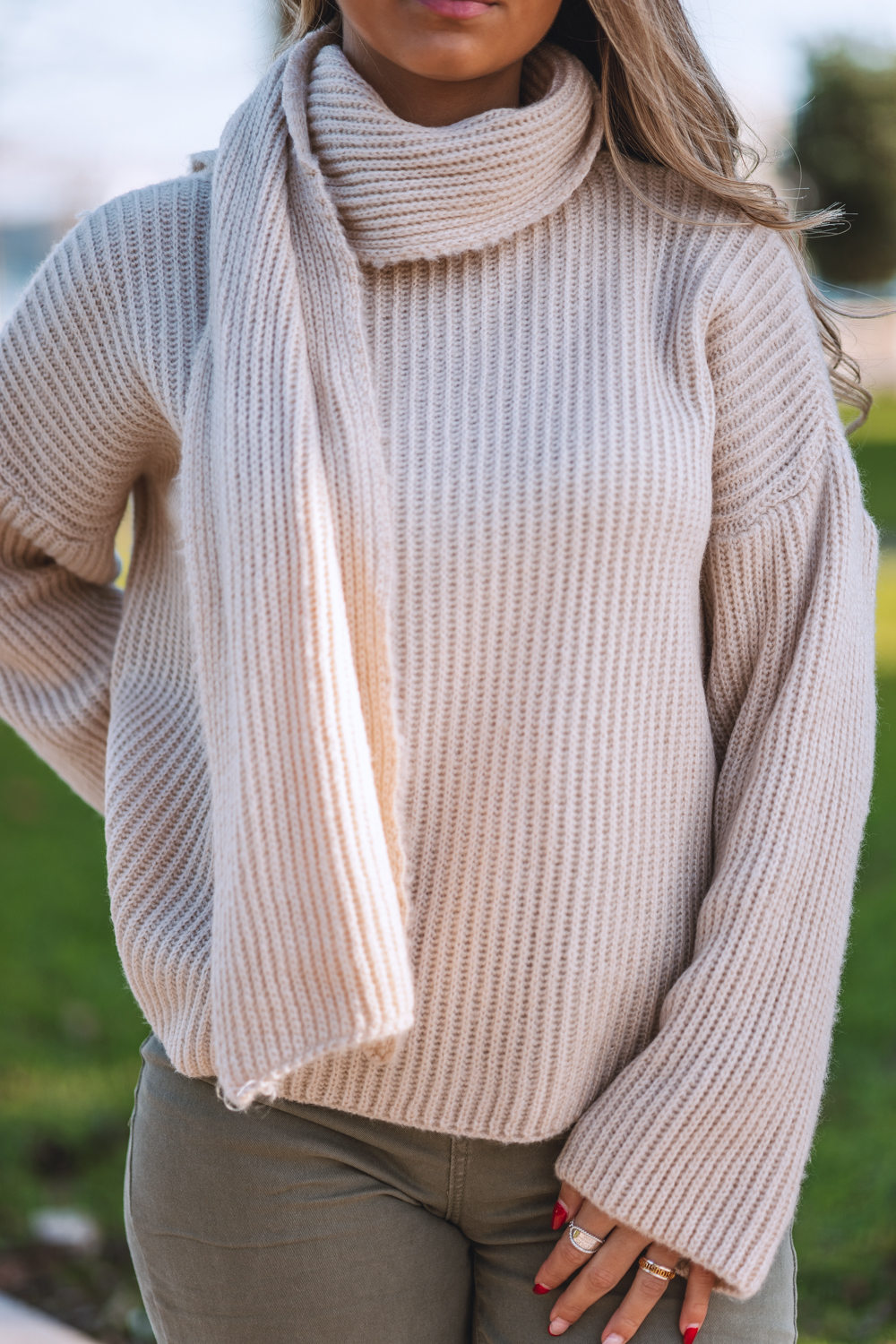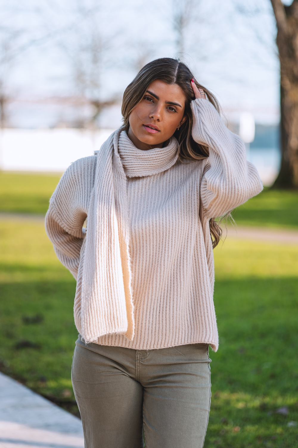 Camisola tricotada, com cachecol incorporado que adiciona charme e praticidade aos dias frios.