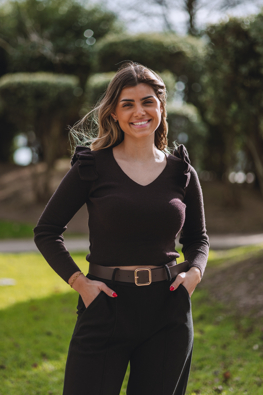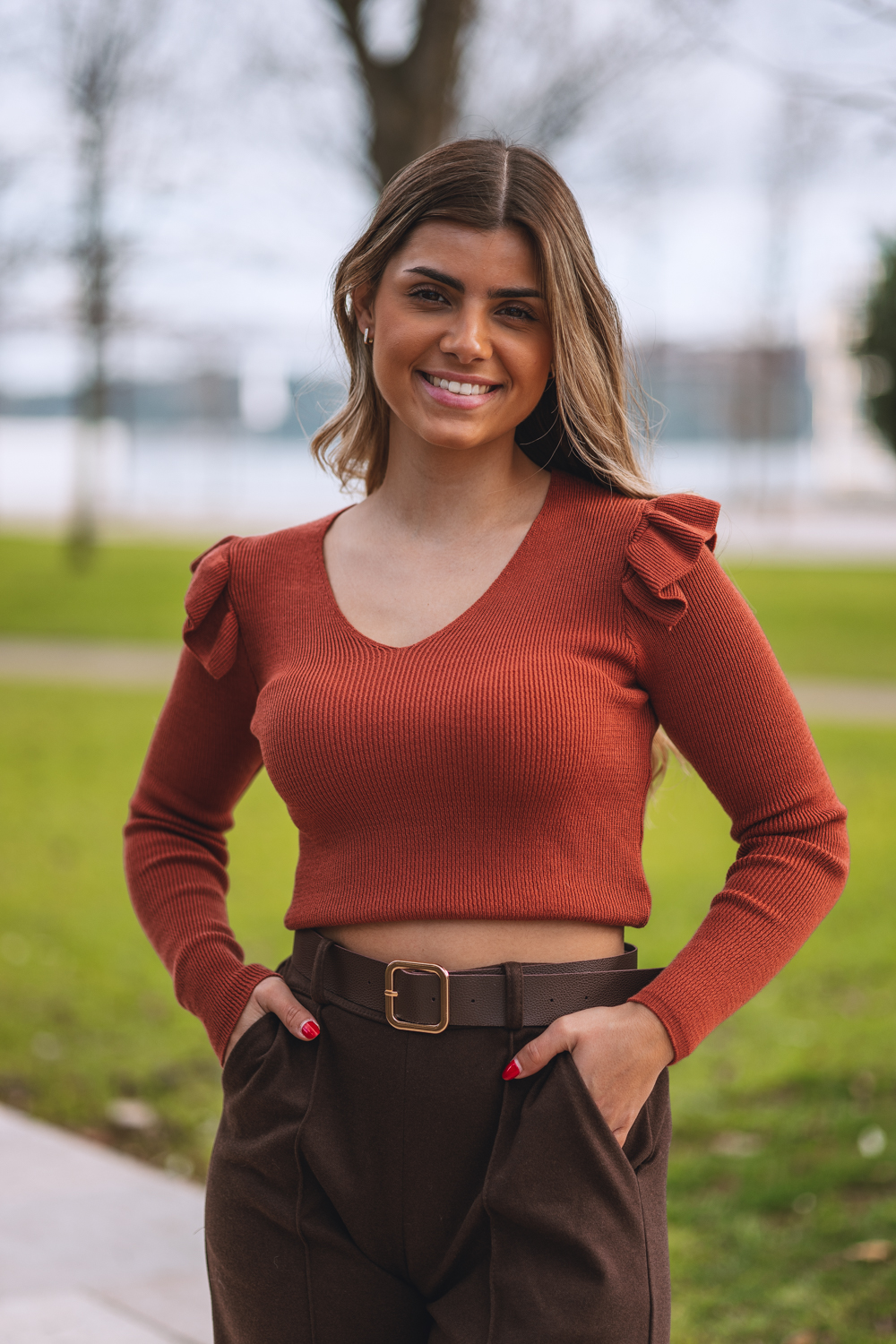 A modelo mede 152cm e está a vestir um TU