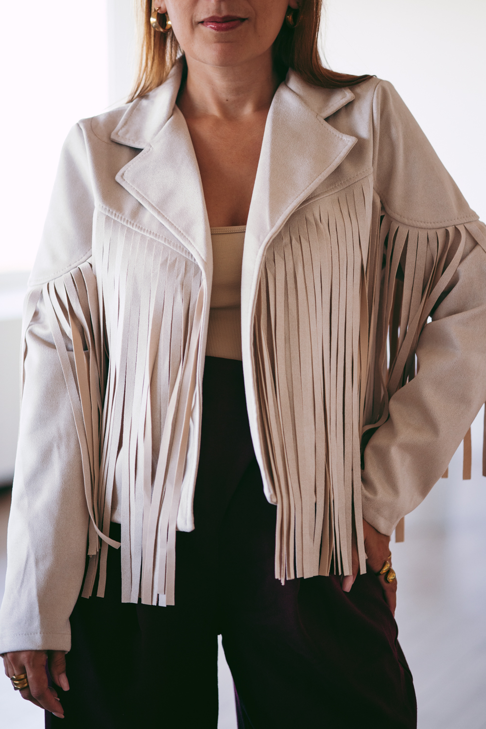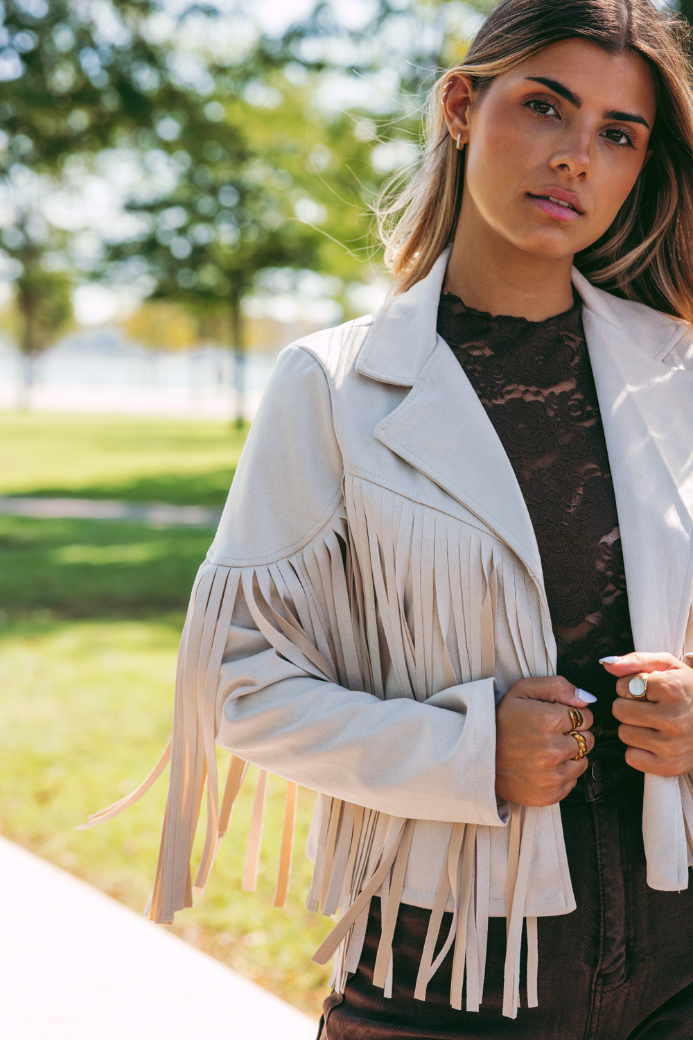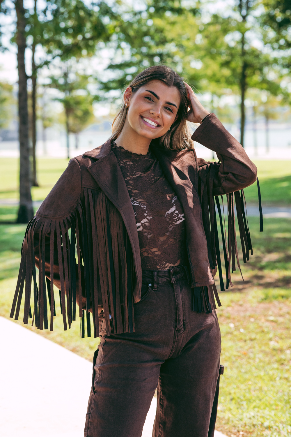 Casaco de tecido estilo camurça com gola e fitas penduradas