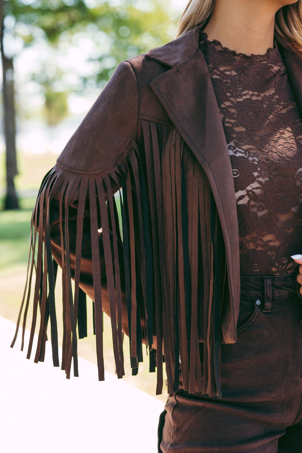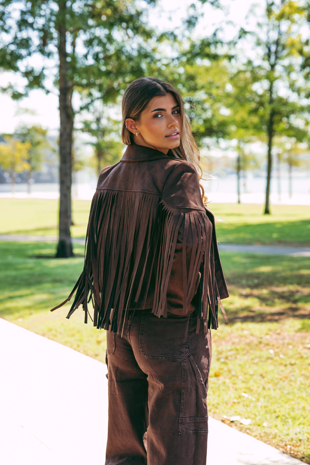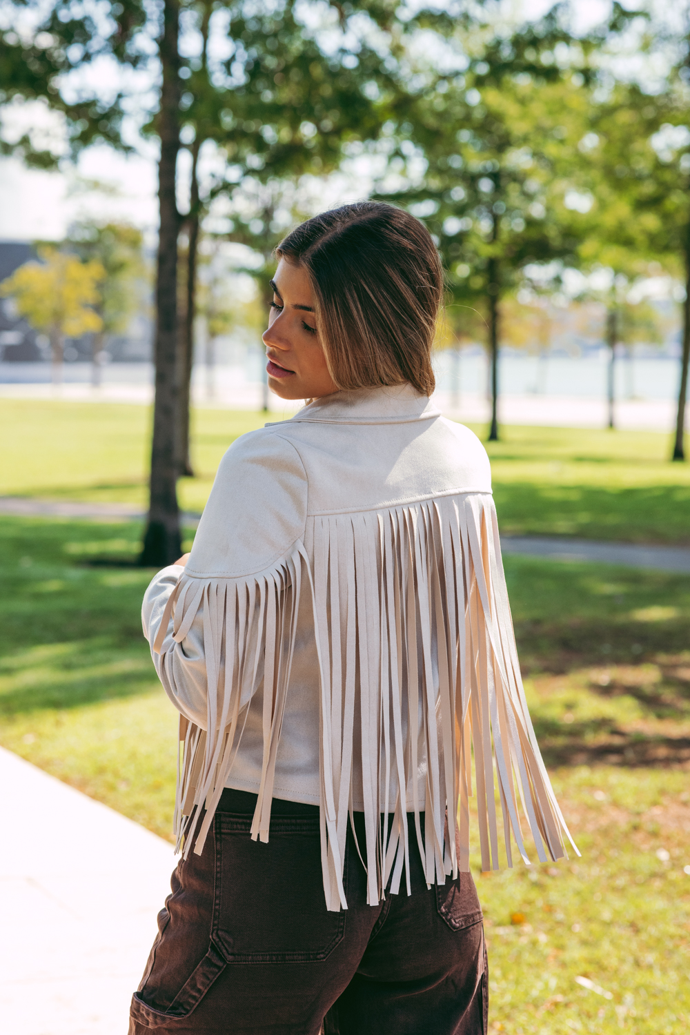 Casaco de tecido estilo camurça com gola e fitas penduradas