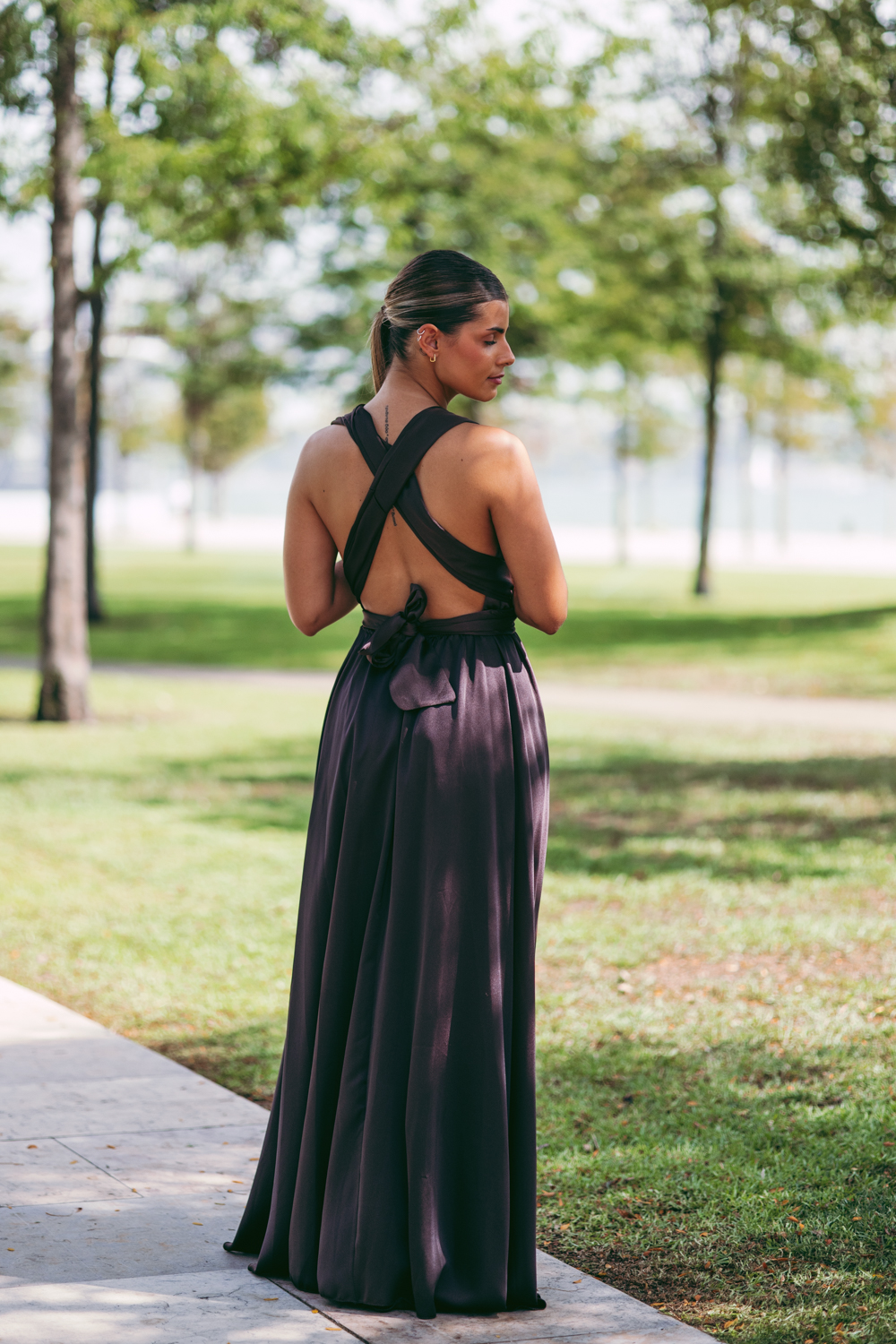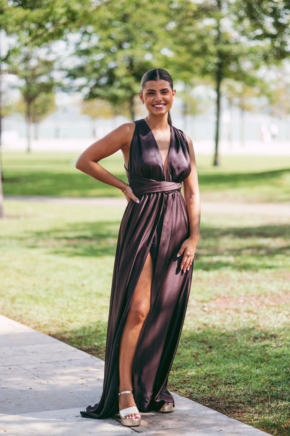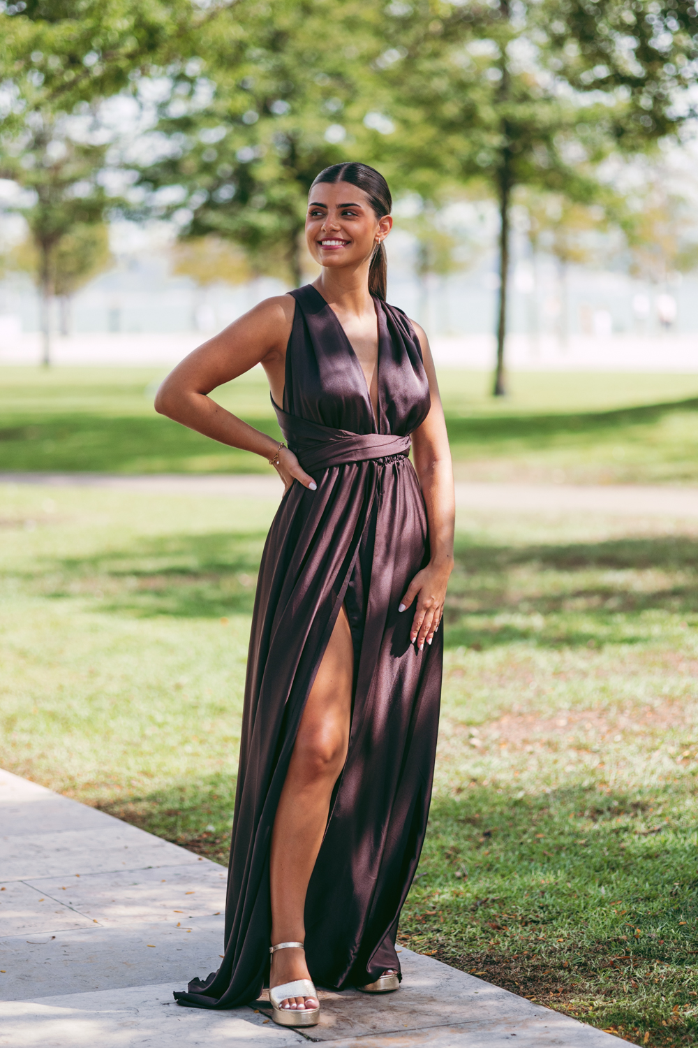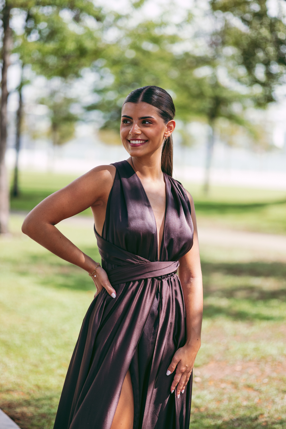 Vestido comprido de tecido acetinado de atar atrás, várias formas de atar, com cintura elástica e racha