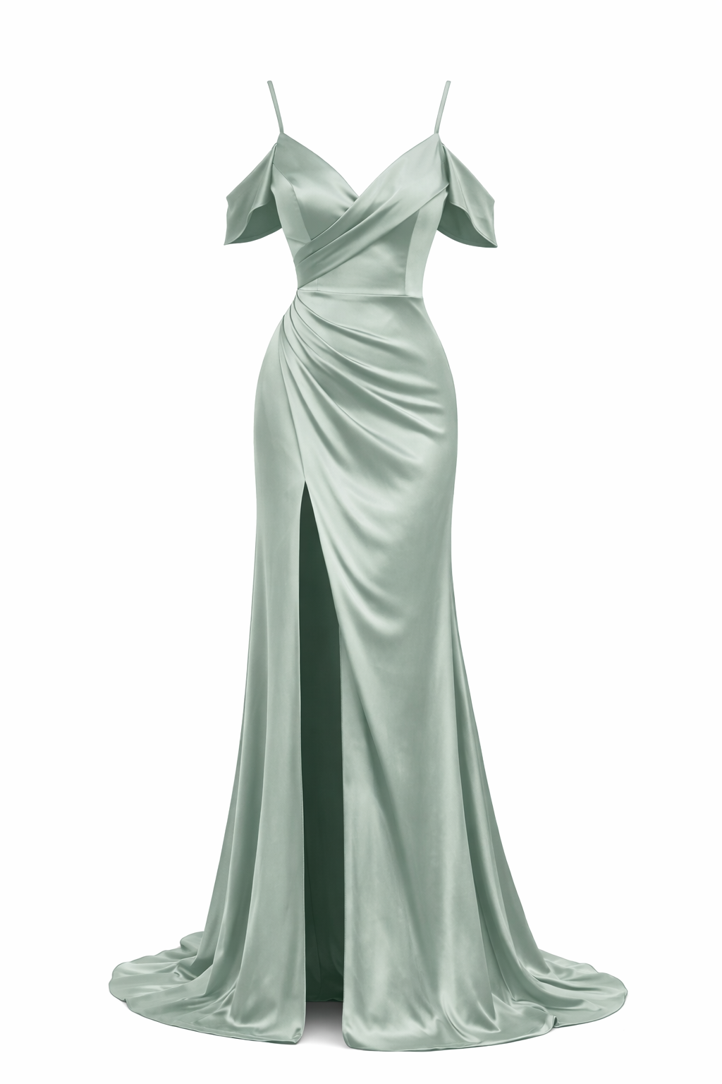 Vestido longo com corte ajustado e cauda suave, em tecido acetinado que realça a elegância. Decote em V com alças finas e ombros descobertos, combinando sofisticação e leveza. Ideal para cerimónias e bailes formais.