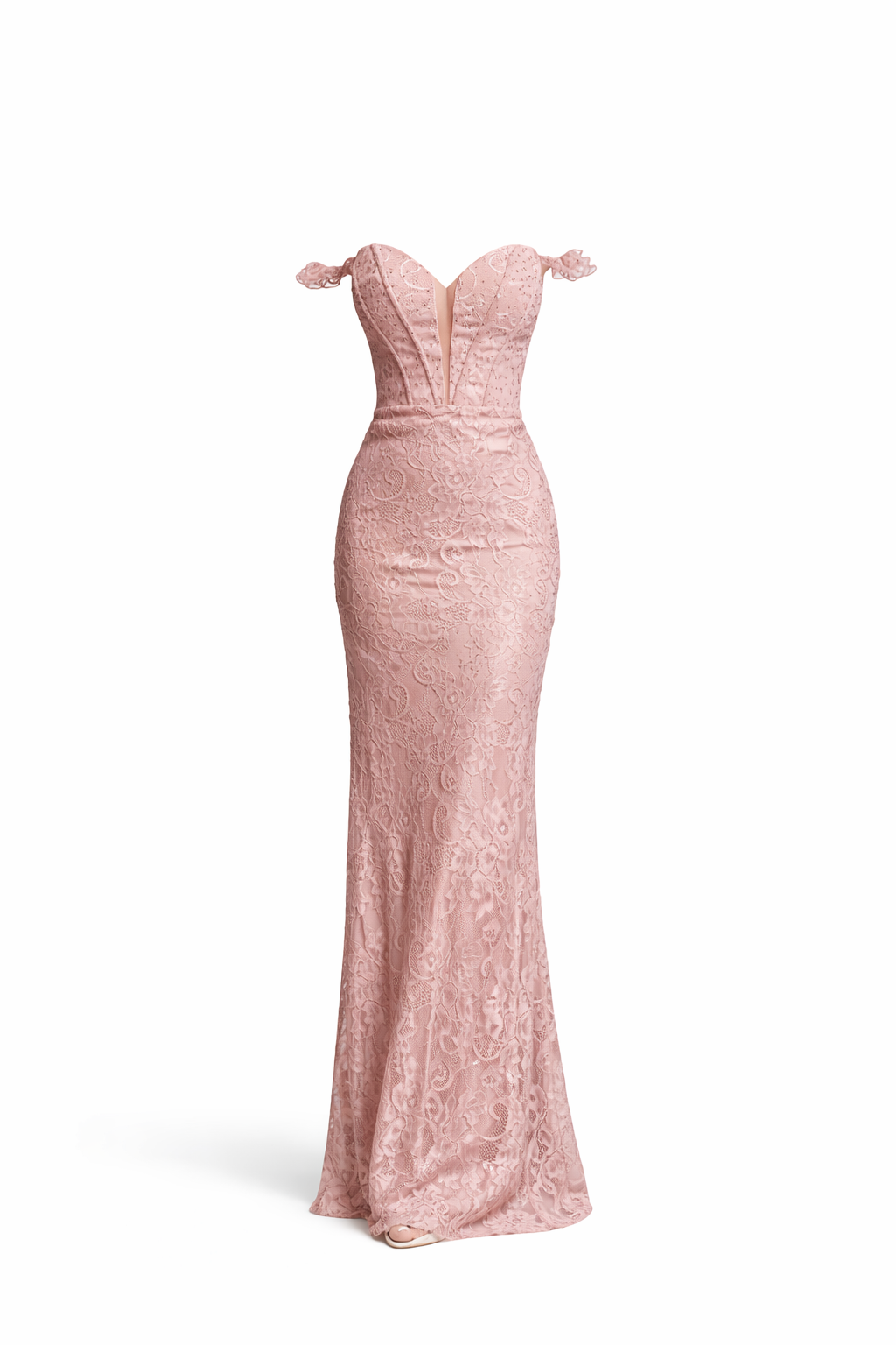 Vestido longo com corte justo que realça a silhueta, em renda rosa delicada. Decote em coração com detalhe de ombros caídos, ideal para cerimónias e eventos formais. Elegância e sofisticação num estilo intemporal.