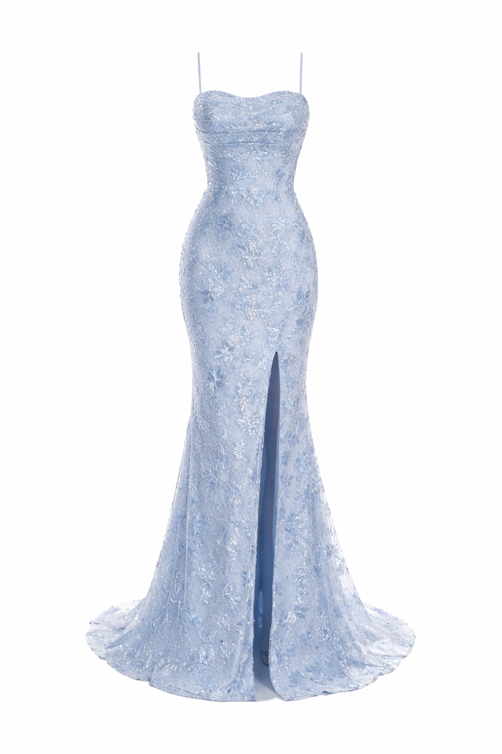 Vestido longo com corte justo que realça a silhueta, em tom azul delicado com padrão floral subtil. Decote coração com alças finas e uma fenda frontal que confere um toque elegante e moderno. Ideal para cerimónias e eventos formais.