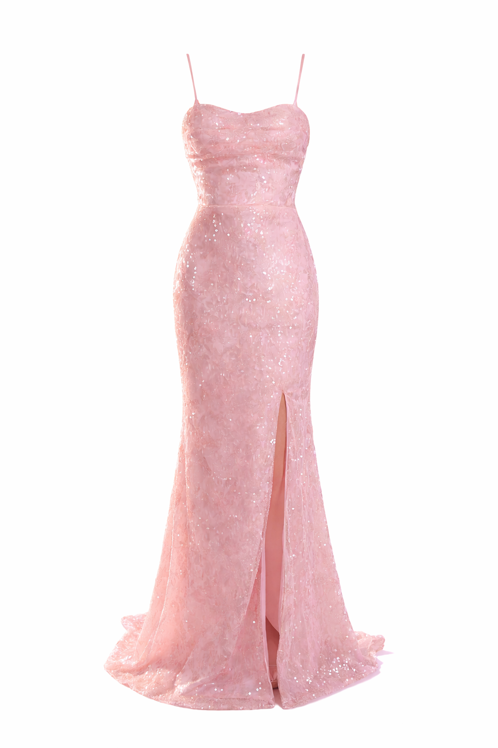 Vestido longo com corte justo que realça a silhueta, em tom azul delicado com padrão floral subtil. Decote coração com alças finas e uma fenda frontal que confere um toque elegante e moderno. Ideal para cerimónias e eventos formais.