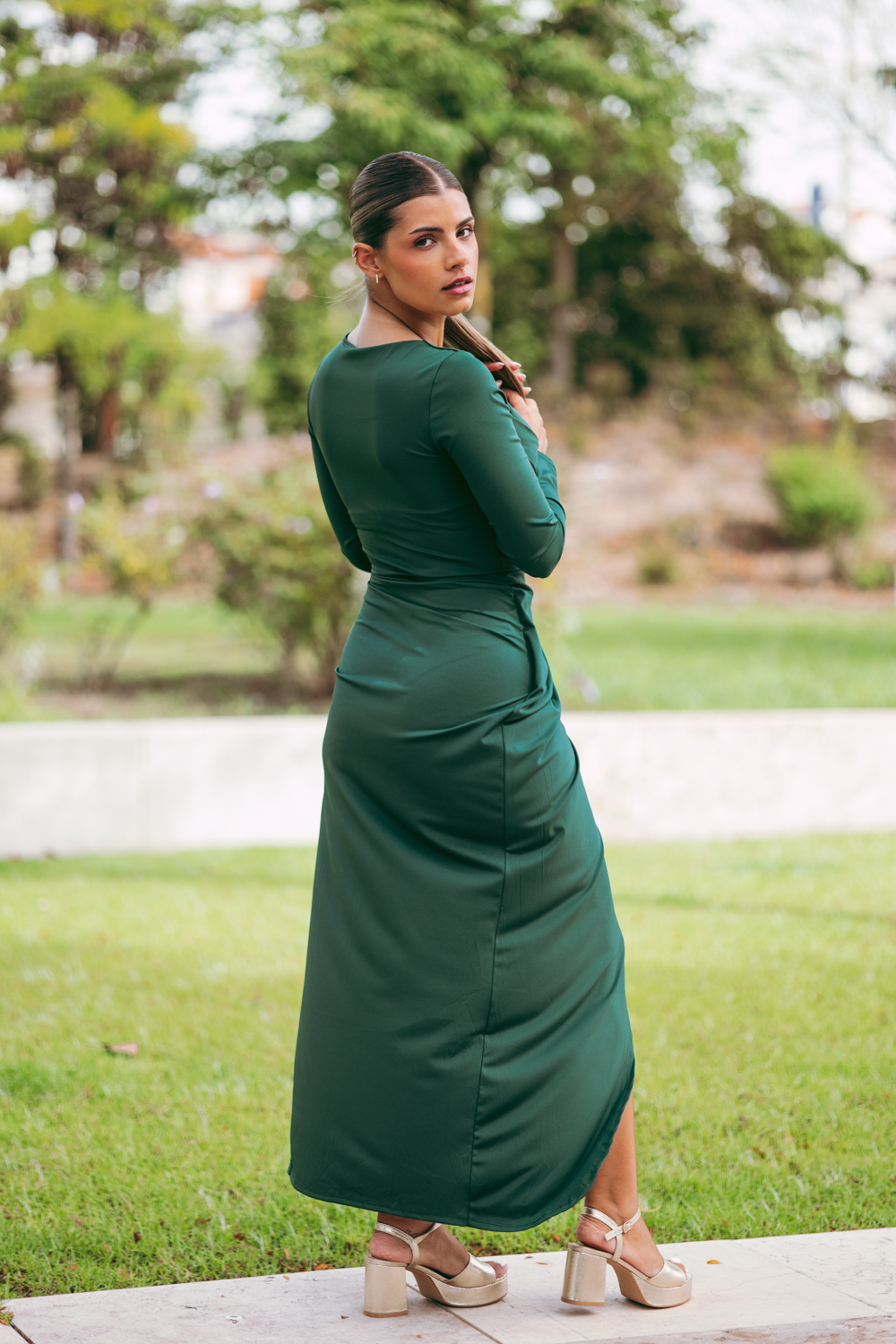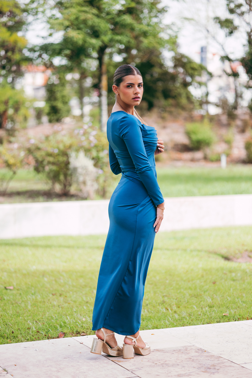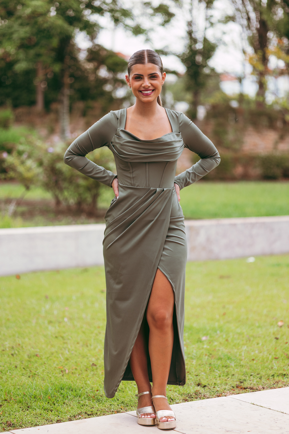 Vestido comprido, com copas, decote drapeado e racha