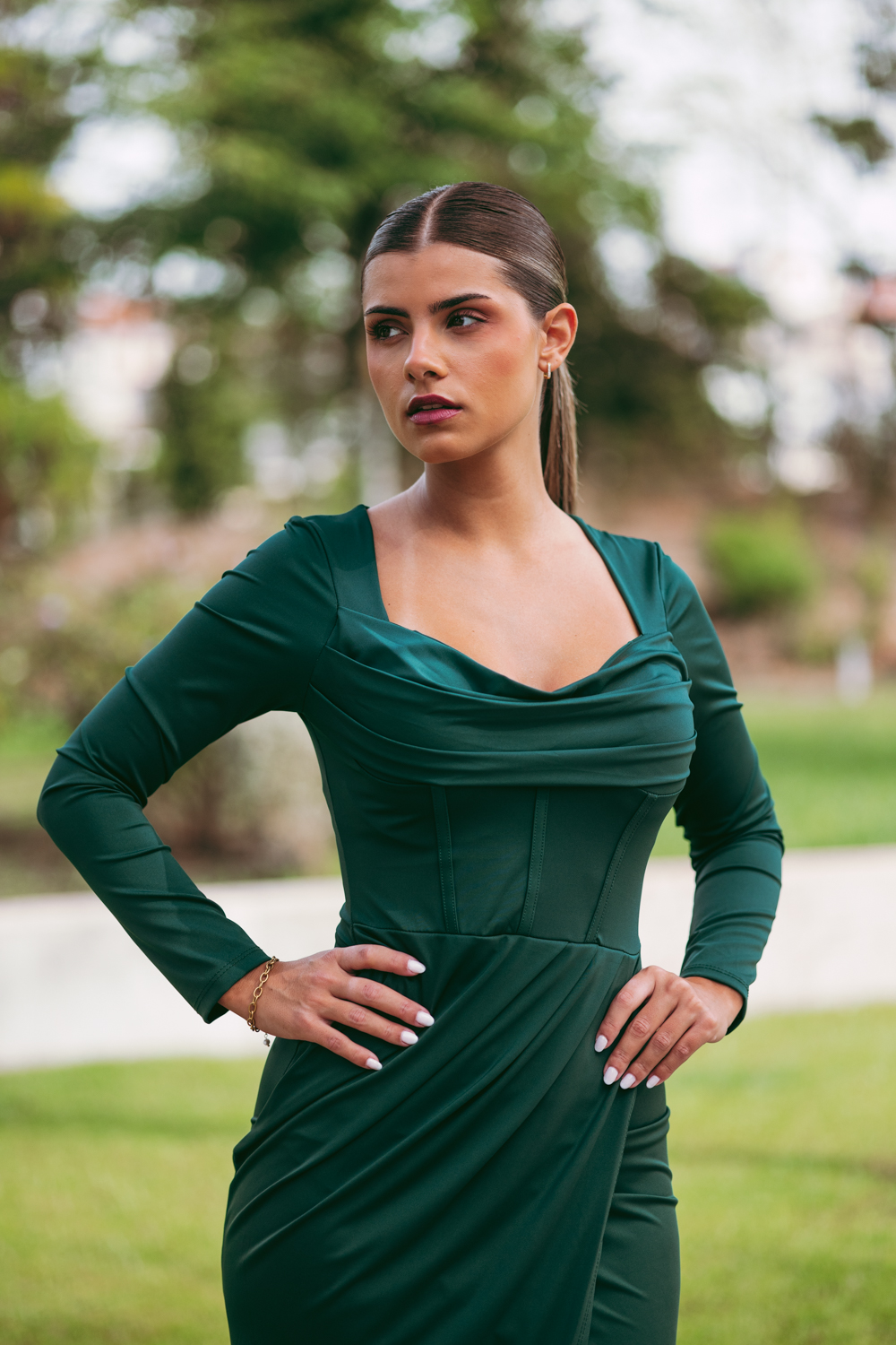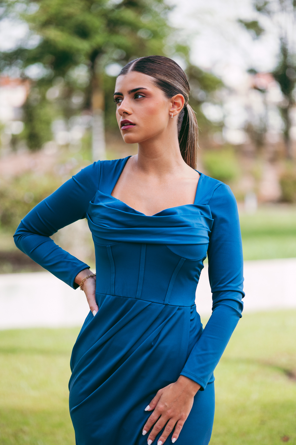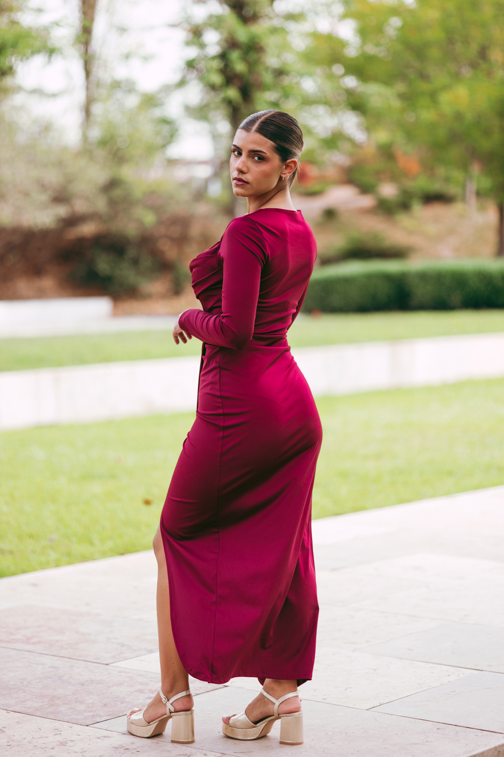 Vestido comprido, com copas, decote drapeado e racha