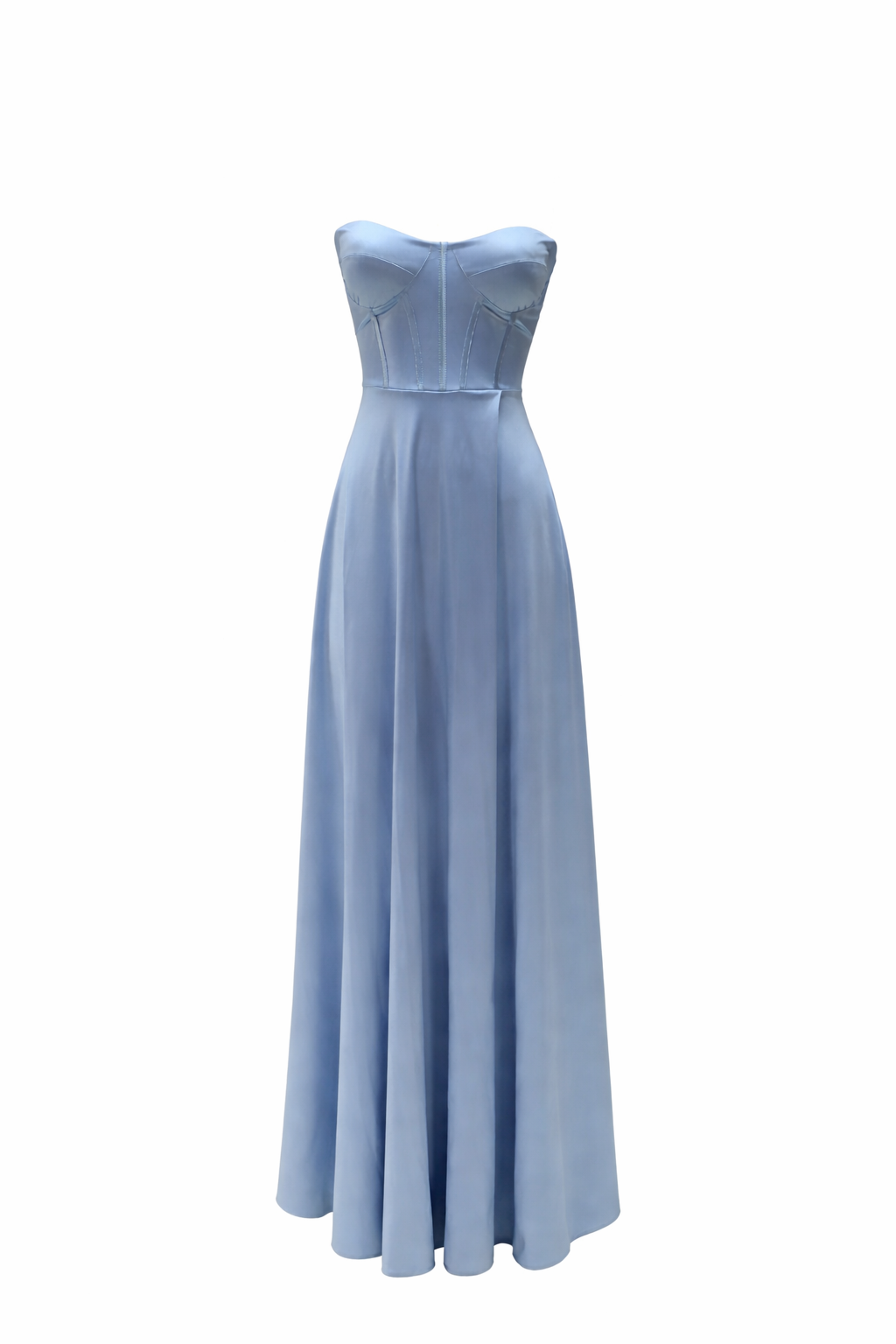 Vestido comprido de tecido acetinado, com copas, espartilho e fecho atrás e racha
