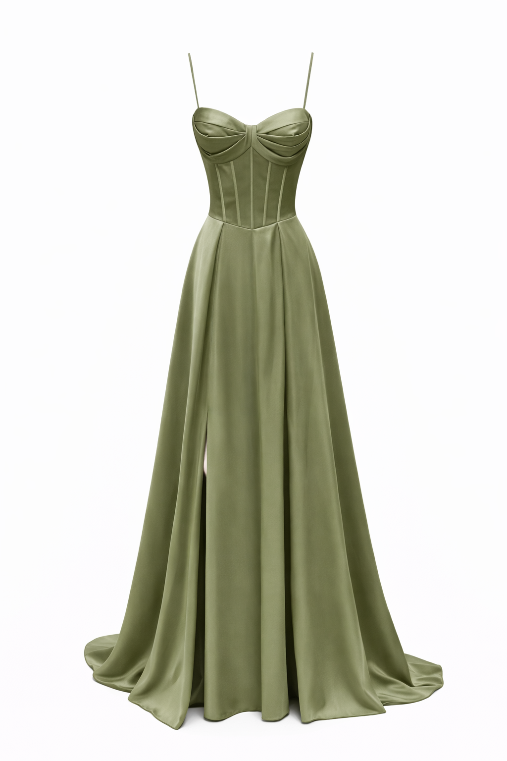 Vestido longo em verde oliva com corte fluido e elegante, que destaca a cintura com um corpete estruturado e alças finas. O decote em coração e a fenda lateral conferem um toque sofisticado, ideal para cerimónias e bailes formais. • Corte fluido • Decote coração • Alças finas