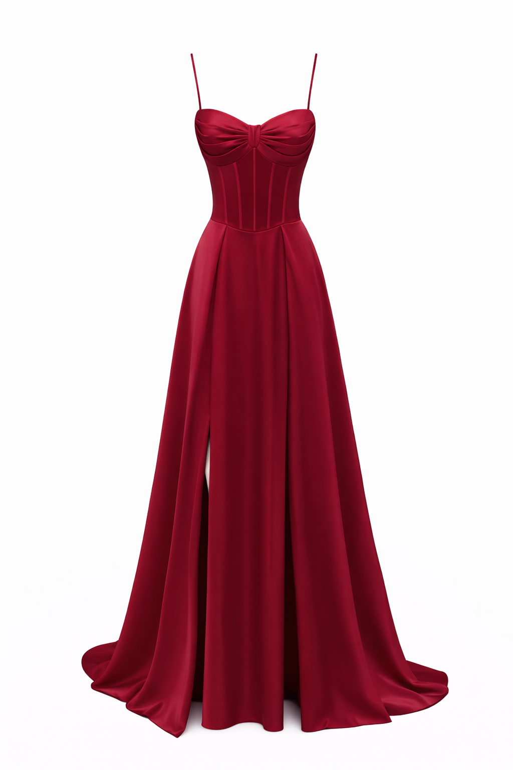 Vestido longo em verde oliva com corte fluido e elegante, que destaca a cintura com um corpete estruturado e alças finas. O decote em coração e a fenda lateral conferem um toque sofisticado, ideal para cerimónias e bailes formais. • Corte fluido • Decote coração • Alças finas