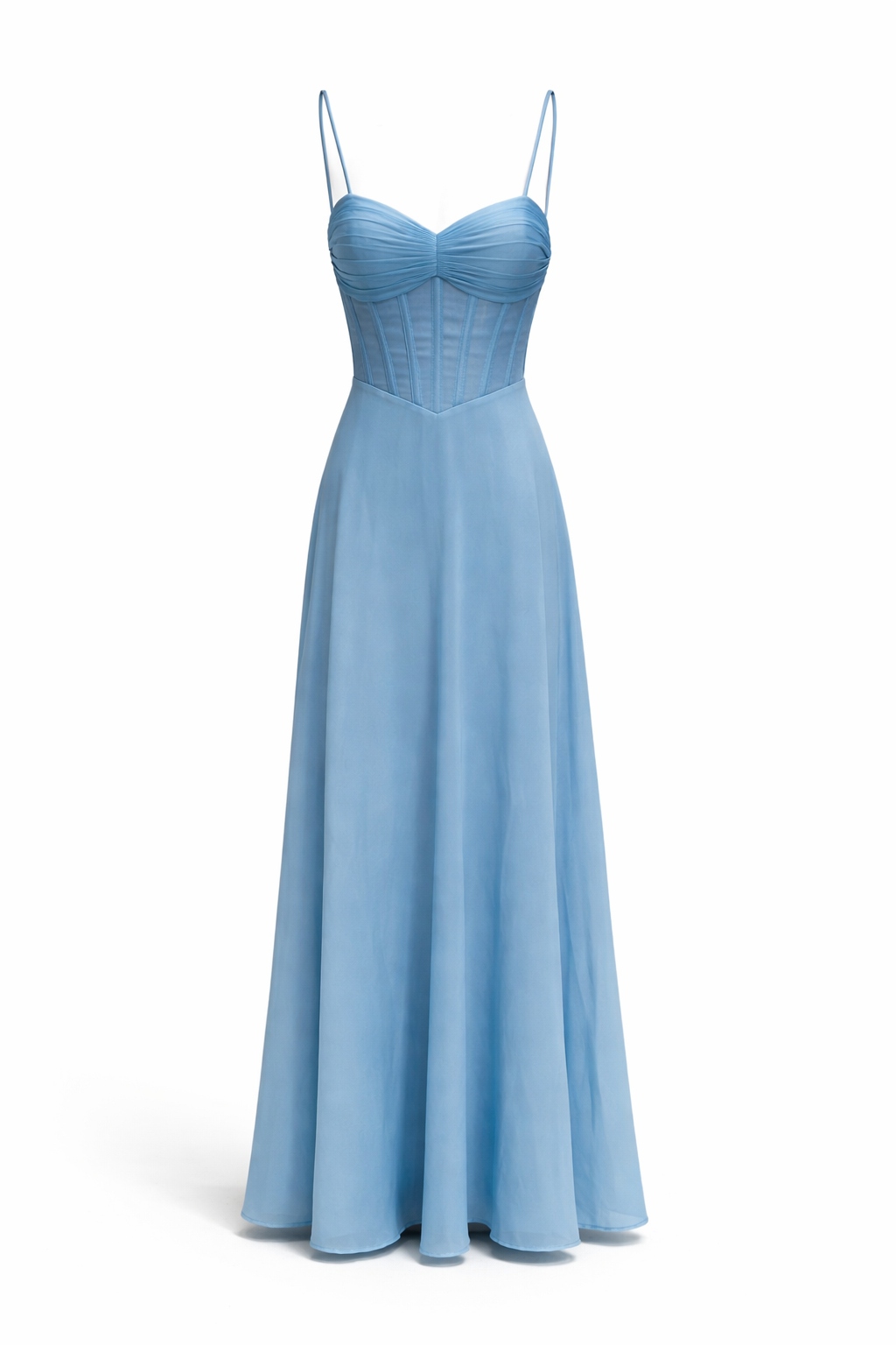 Vestido longo com corte fluido e corpo estruturado, realçando a silhueta com alças finas e decote em coração. Ideal para cerimónias e eventos formais, combina elegância e delicadeza num tom azul suave. • Corte fluido • Decote coração • Alças finas
