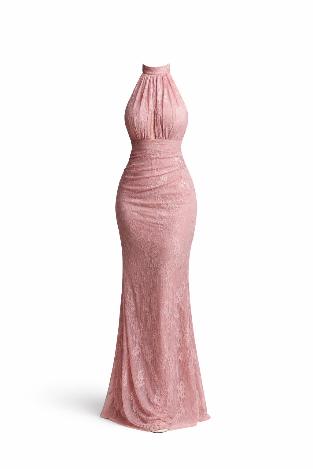 Vestido longo com corte justo que realça a silhueta, em tom rosa delicado. Apresenta decote halter com detalhe franzido e tecido com padrão floral subtil. Ideal para cerimónias e eventos formais, conferindo elegância e sofisticação.