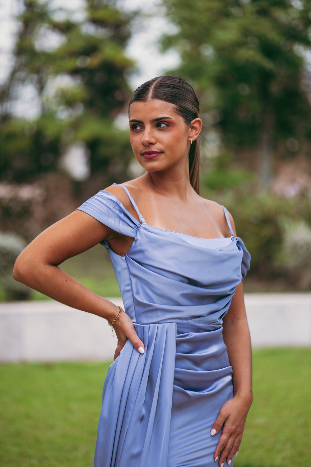 Vestido comprido, de tecido acetinado, com decote drapeado de ombro a ombro, copas, racha do lado direito com faixa de tecido sobreposta, combinação de alças finas, ajustáveis e removíveis, espartilho e fecho atrás