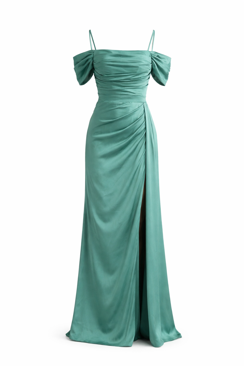 Vestido longo com corte ajustado e drapeado na saia, destacando a silhueta. Decote ombro a ombro com mangas curtas que conferem um toque elegante e sofisticado. Ideal para cerimónias e eventos formais.