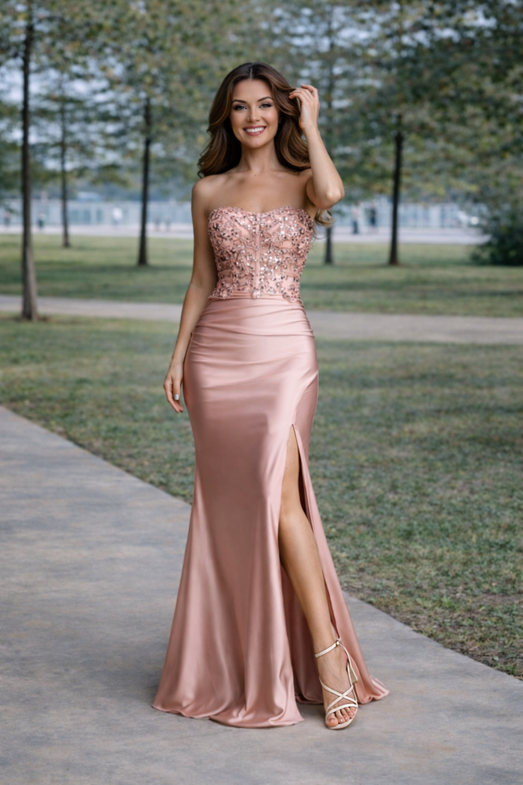 Vestido longo com corte ajustado que realça a silhueta, destacando-se pelo corpete sem alças com detalhes brilhantes. A saia fluida apresenta uma fenda lateral que acrescenta um toque de elegância e sensualidade. Ideal para cerimónias e eventos formais.