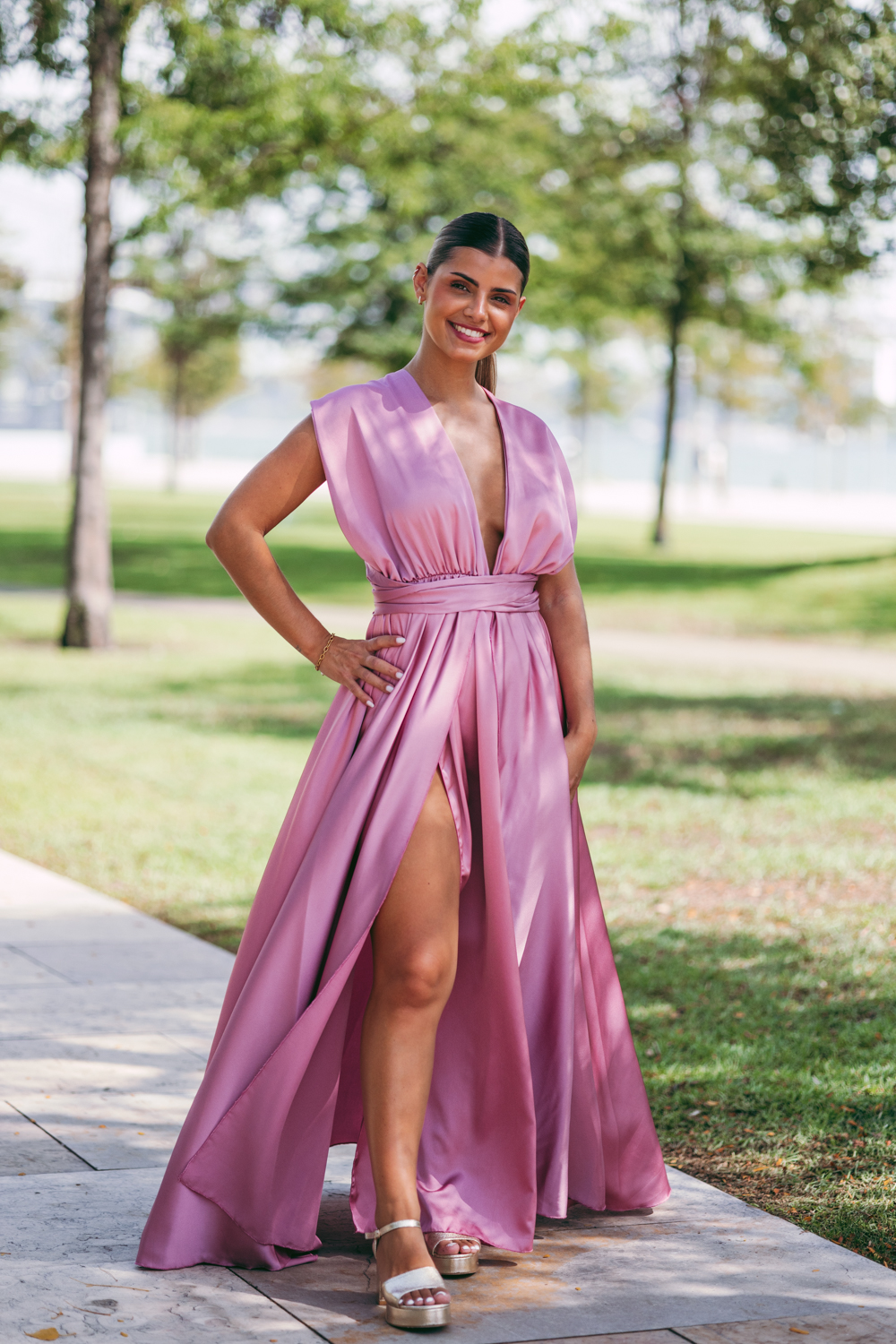 Vestido comprido de tecido acetinado de atar atrás, várias formas de atar, com cintura elástica e racha
