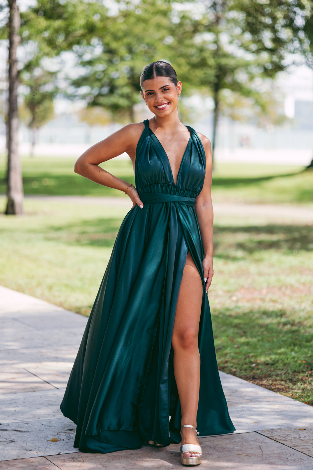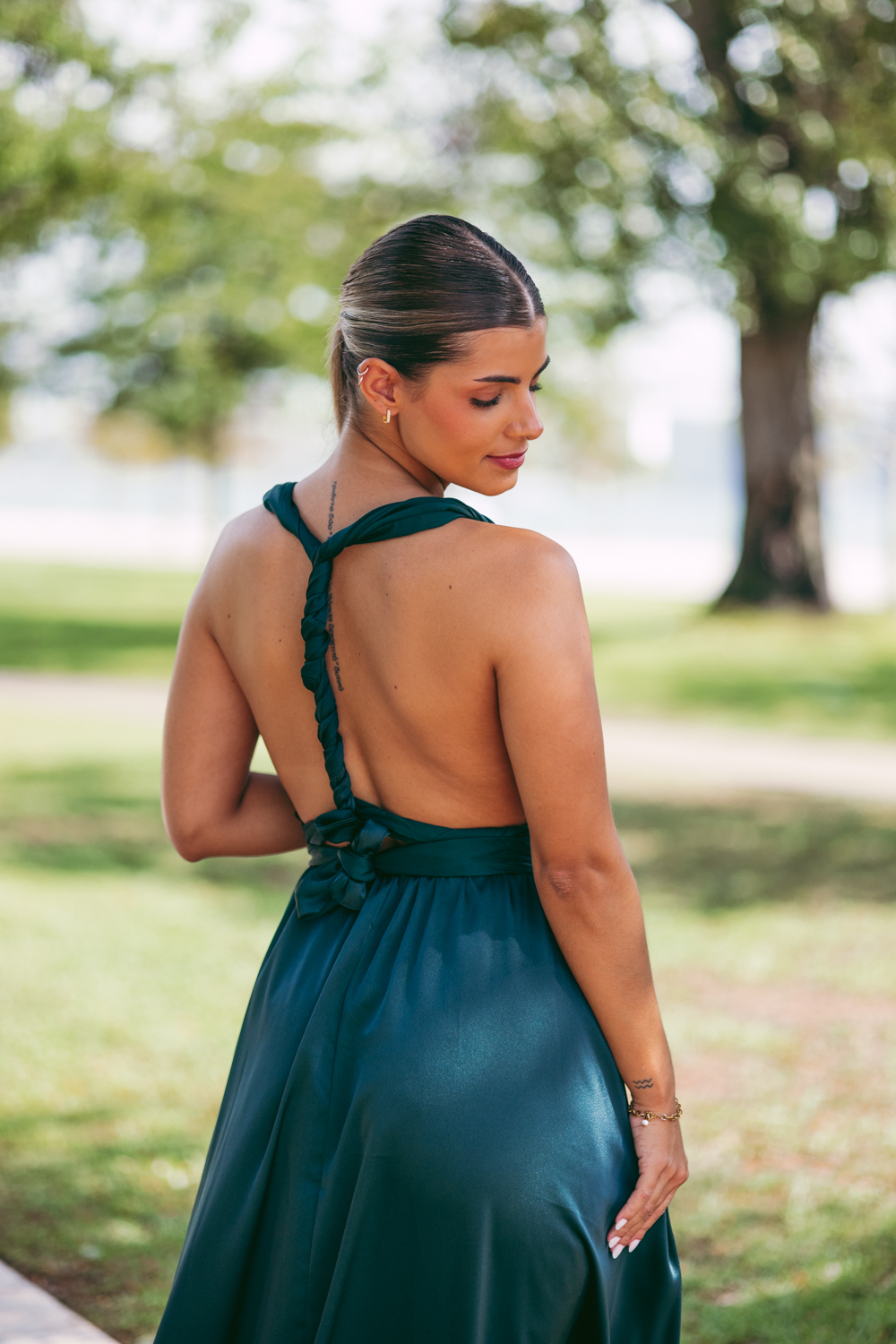 Vestido comprido de tecido acetinado de atar atrás, várias formas de atar, com cintura elástica e racha